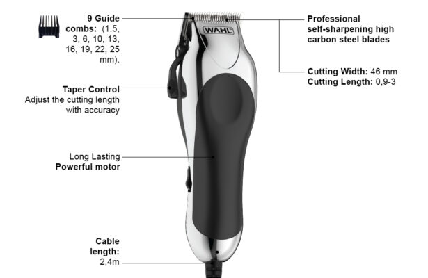 H CHROME PRO είναι η πανίσχυρη κουρευτική μηχανή ρεύματος η οποία θα καλύψει κάθε σου ανάγκη για “DIY barbering”. Οι λεπίδες από ατσάλι με ανθρακονήματα καθώς και το “Powerdrive” μοτέρ της, εγγυόνται γρήγορη και σταθερή κοπή ανεξάρτητα από τον τύπο μαλλιών. Η στιβαρή κατασκευή της θα σε ενθουσιάσει. Επιπλέον το λεβιέ ρύθμισης του μήκους κοπής (taper control) θα σου δώσει τη δυνατότητα να επιλέξεις ανάμεσα σε απεριόριστα μήκη (από 0,9mm έως 25mm) και να δημιουργήσεις το στυλ που σου ταιριάζει, από το πιο απλό έως και το πιο «επαγγελματικό» με σβησίματα και layerings. Υποστηρίζει 100% κάθε project DIY περιποίησης & styling.